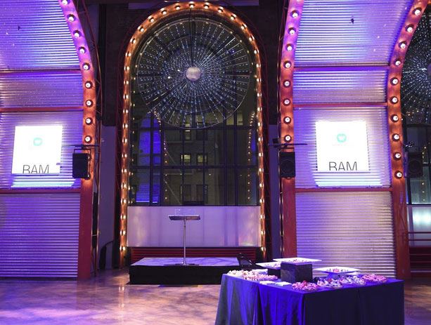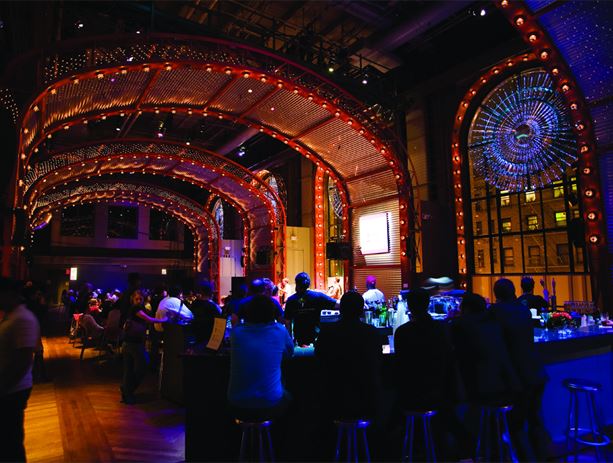 First designed as a ballroom, then recast as a theater for groundbreaking work, The Adam E. Max Gathering Space took its current design in 1997 as BAM's flexible public living room, a dazzling open-plan hall housing BAMcafé. Hardy Holzman Pfeiffer Associates oversaw the renovation, preserving the spaciousness of the original ballroom with vaulted red arches lined with silver-tipped light bulbs. This dramatic space makes a stylish setting for receptions, meetings, and parties.