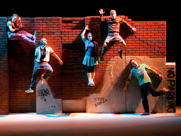 In this remarkable work of acrobatic choreography from Canada, children learn the universal language of movement. Mur-Mur (The Wall) reveals a world of humor, innocence, and discovery through the story of friendship among five characters: two teenage couples and a pesky younger brother. Keeping dialogue to a minimum, the artists use soaring gymnastics and air-bound choreography to express a range of emotions.