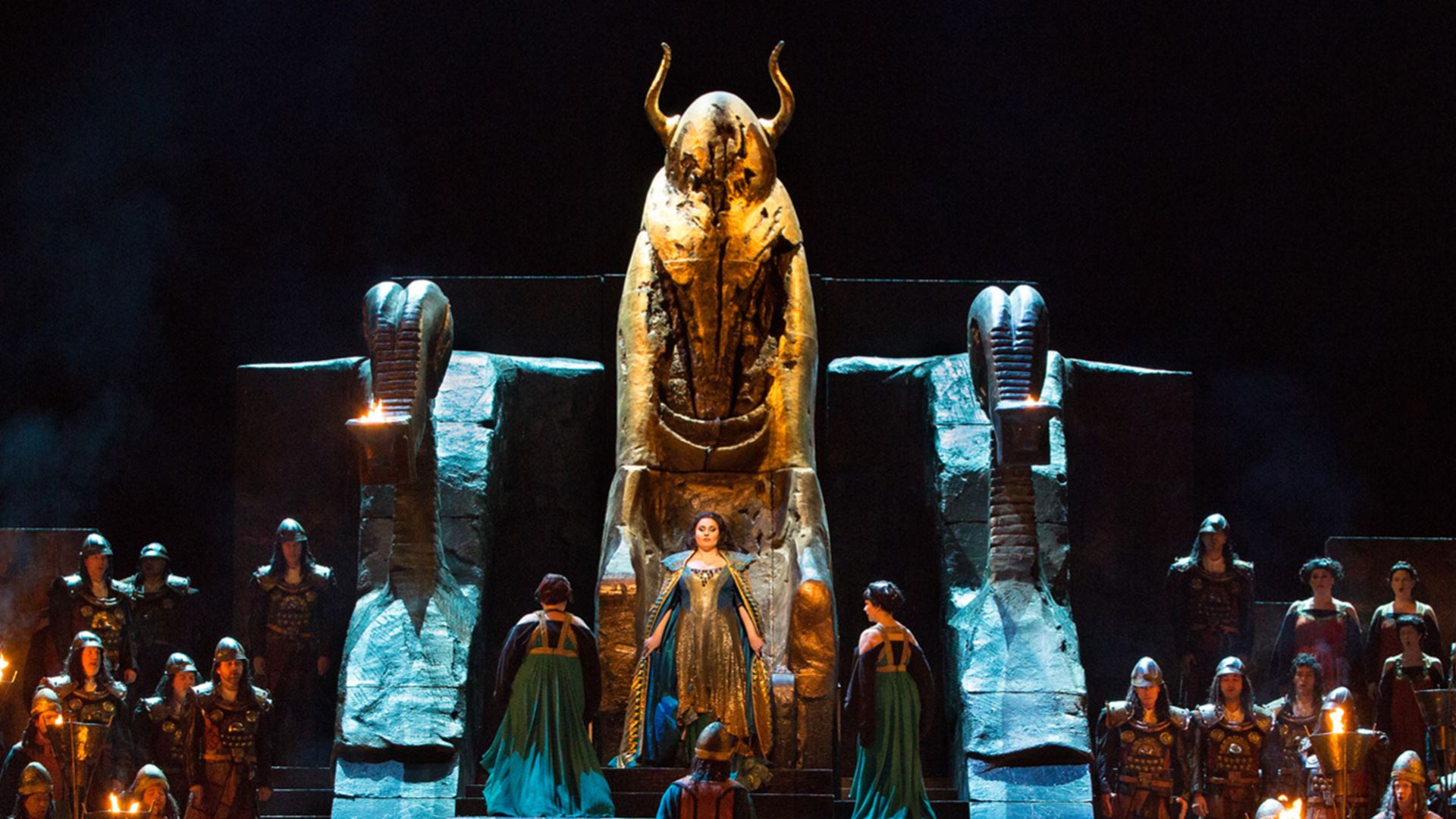 Ancient Babylon comes to life in this classic Met staging of biblical proportions. Baritone George Gagnidze stars as the imperious king Nabucco, alongside soprano Liudmyla Monastyrska, reprising her thrilling turn as his vengeful daughter Abigaille. Mezzo-soprano Maria Barakova and tenor SeokJong Baek are Fenena and Ismaele, whose love transcends politics, and bass Dmitry Belosselskiy repeats his celebrated portrayal of the high priest Zaccaria. Daniele Callegari conducts Verdi’s exhilarating early masterpiece, which features the ultimate showcase for the great Met Chorus, the moving “Va, pensiero.”